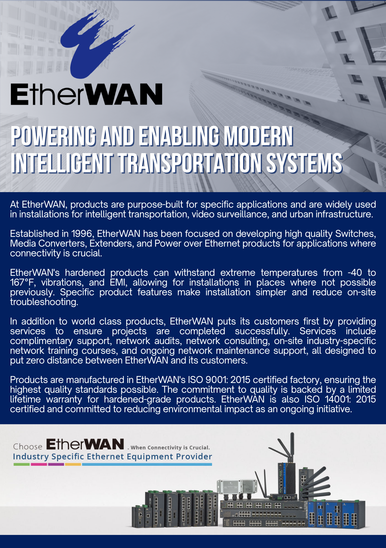 EtherWAN offers a full line of Ethernet switches that deliver world-class performance and dependability. With an emphasis on hardened designs for industry specific connectivity solutions, EtherWAN also offers commercial and enterprise grade network switches in the following categories: Unmanaged, Web-smart, and Managed Switches.