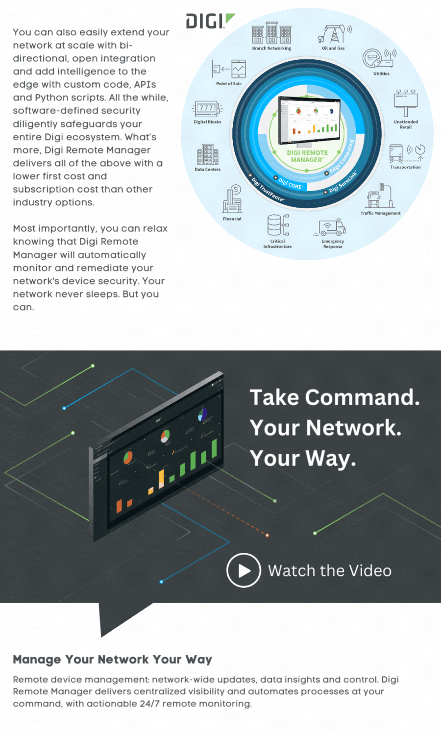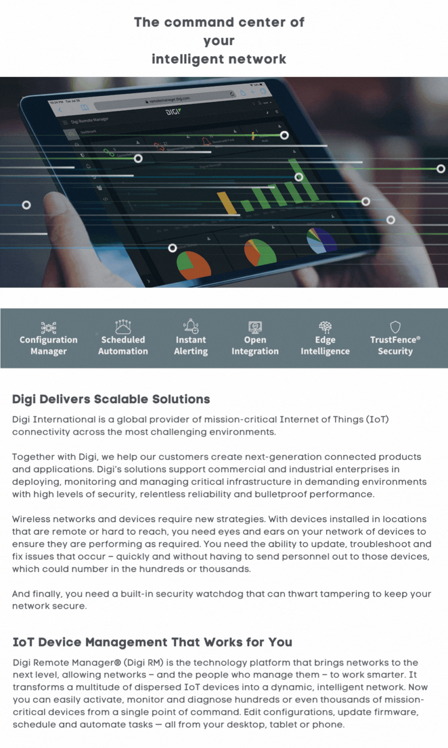 Meet performance obligations and security requirements with fast, efficient troubleshooting — as well as remote configuration and performance monitoring — while enjoying greater device reliability. Digi Remote Manager provides an efficient, cost effective comprehensive IoT device management application for secure asset deployment, monitoring and control.