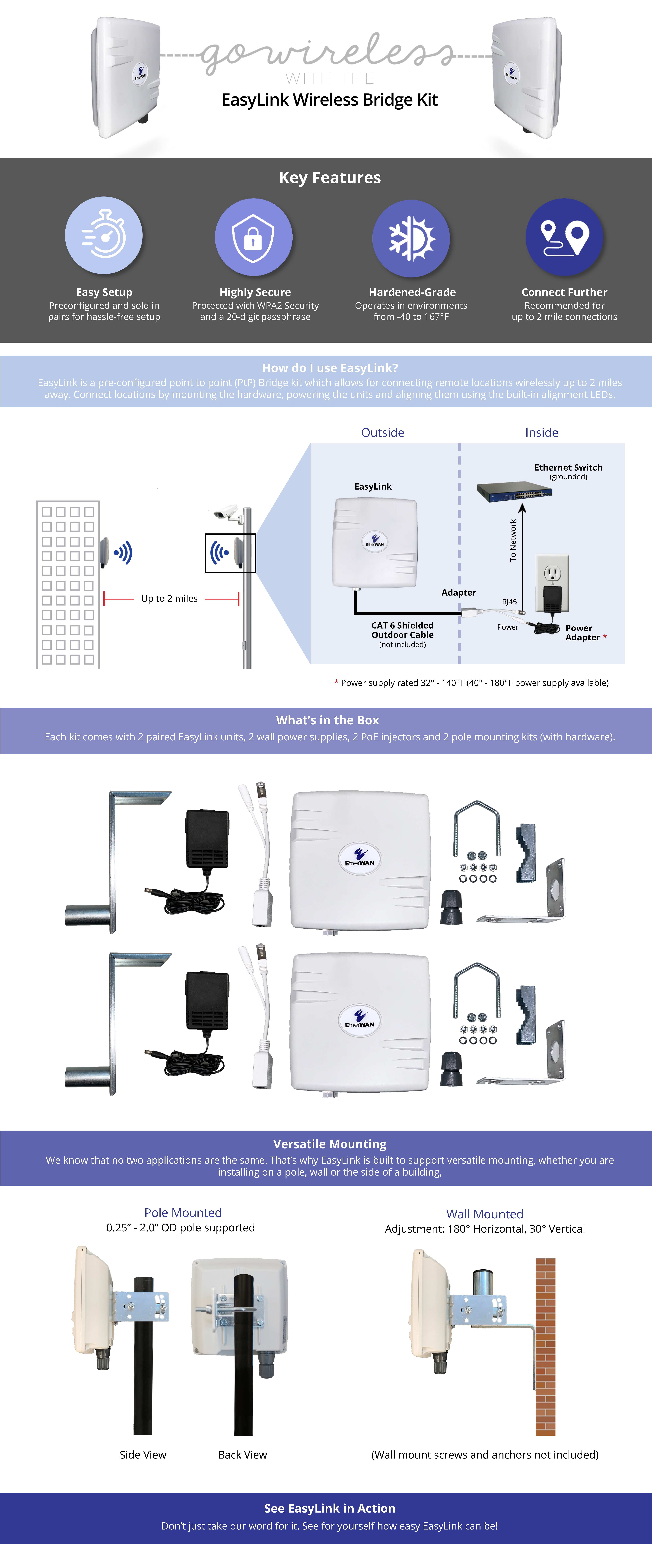 EtherWAN's EasyLink is a pre-configured point to point (PtP) Bridge kit which allows for connecting remote locations wirelessly up to 2 miles away. EasyLink's simple setup allows you to connect locations by mounting the hardware, powering them on and aligning the units using the built-in alignment LEDs. Each kit contains two paired units that connect automatically using a highly secure, unique, hidden SSID and randomly-generated passphrase to keep your valuable equipment secure right out of the box. No need for complicated setup software, just plug it in, aim it and you are connected.